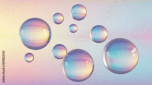 © A - Z, Naklejka premium Iridescent Bubbles Floating Against a Gradient Pastel Background