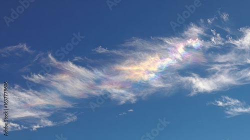 Naklejka premium Iridescent Cloud Displaying Rainbow Colors Against Blue Sky Backdrop -...