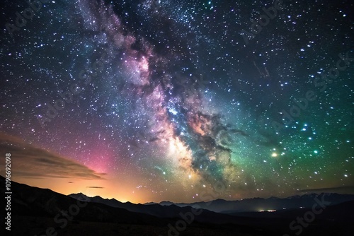 Fototapeta premium Iridescent colors blending with starlight in a deep space background, stellar...