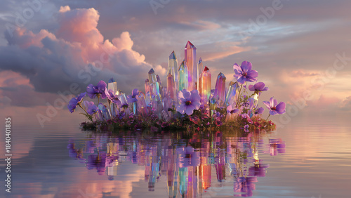 © Designbrisa, Obraz premium Iridescent Crystal Garden Blossoming Over Calm Reflective Water at Sunset