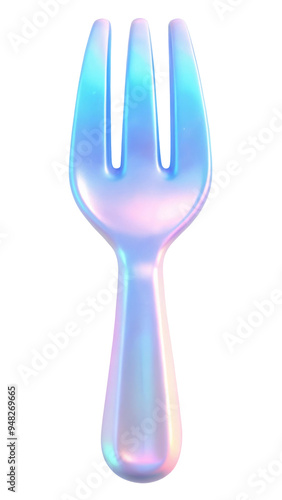 © kanoktuch, Fototapeta premium Iridescent 3d plastic fork with three prongs, showcasing a shimmering gradient of pastel colors. Isolated on transparent background, png.