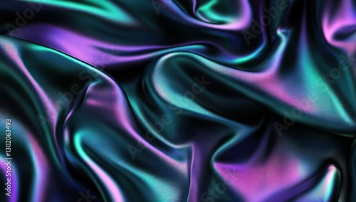 © malayeka, Obraz premium Iridescent fabric with flowing, wavy texture in teal, purple, and black.