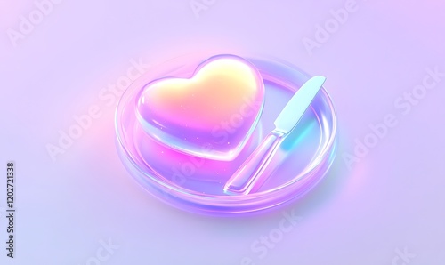 © Maryanto, Fototapeta premium Iridescent heart-shaped dessert on plate with knife.