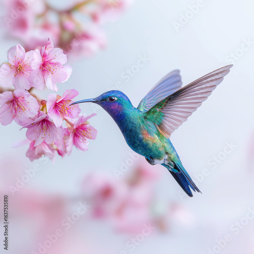 © kami, Fototapeta premium iridescent hummingbird hovering mid-air sipping nectar from soft pink blossoms, wings frozen in motion against white background, vivid spring floral detail with delicate feathers