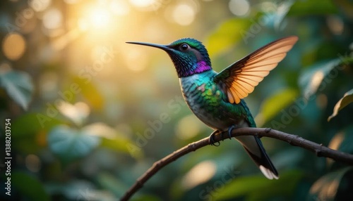 © Khofi, Obraz premium Iridescent Hummingbird Perched, Wings Ajar, Sunlit Foliage, Natural Light.