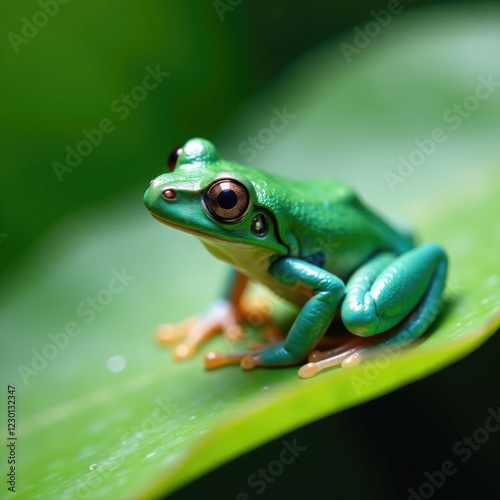 © retirementfun, Naklejka premium Iridescent mint green frog with golden spots on white leaf, frog, leaf