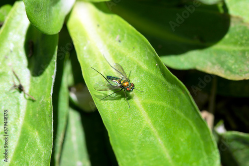 Fototapeta premium iridescent multicolored Garden fly on green leaf