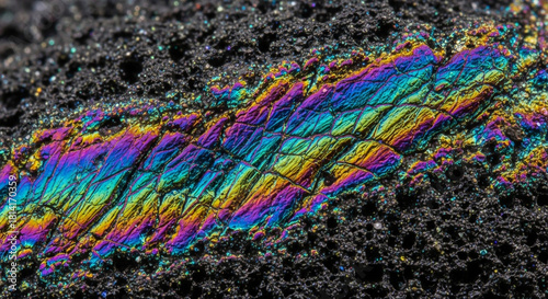 © Madihabibi, Obraz premium Iridescent oil slick on dark asphalt texture creates a stunning rainbow effect, perfect for backgrounds, abstract art, and environmental themes