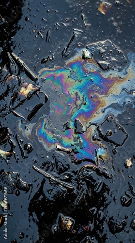 Fototapeta premium Iridescent oil slick on rough asphalt with rainbow sheen for abstract texture...