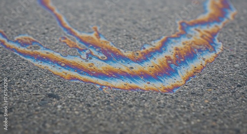 © Winteronlen, Obraz premium Iridescent oil spill on gray asphalt colorful hues of blue orange yellow