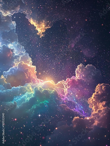 Obraz premium Iridescent rainbow hues and shimmering stardust in a celestial environment, cosmic clouds, abstract space art