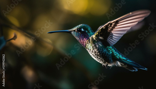 Obraz premium Iridescent rufous hummingbird hovering mid air, pollinating flower generated...