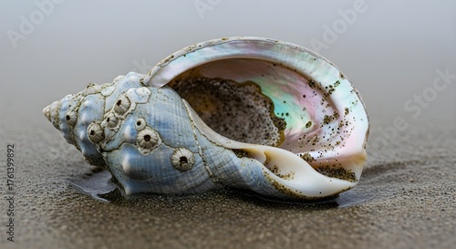 Naklejka premium Iridescent seashell resting on wet sand, showcasing natural beauty and...