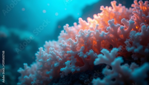 Naklejka premium Iridescent seaweed, coral formations, rose-golden luminescence, oceanic haze, wispy tendrils, delicate lace-like patterns, underwater scene, marine life, sea floor, reef ecosystem, soft light, gentle