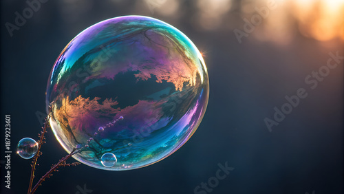 © Nadun, Naklejka premium Iridescent Soap Bubble Resting on Delicate Branch with Dreamy Sunset Reflection