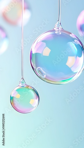 Fototapeta premium Iridescent spheres hang suspended against a pale blue backdrop, showcasing an...