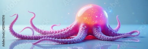 © Anulak, Obraz premium Iridescent tentacles stretch from glowing orb on white surface, glow, aquatic, tentacle