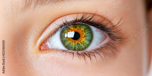 © Tonton1541, Obraz premium iris patterns eye striking close-up green concept. Close-up of a woman's eye with vibrant green and orange iris colors.