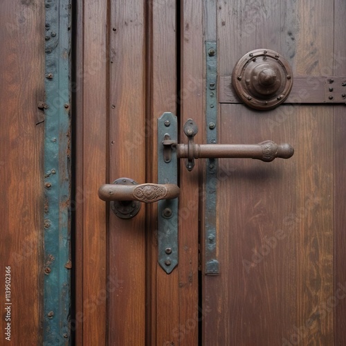 © AiGallery, Fototapeta premium Iron door handle on wooden door with a patina finish , metal, door handle, wooden door