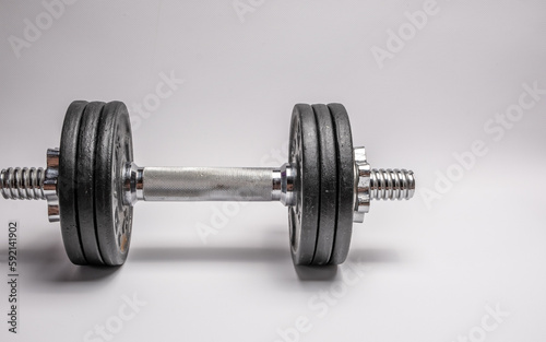 Fototapeta premium Iron dumbbell with pancakes on a white background. Sports with weights.