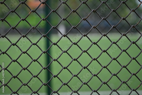 Fototapeta premium iron mesh close-up against the background of a green stadium