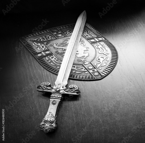© Marina, Fototapeta premium Iron shield and sword on the table