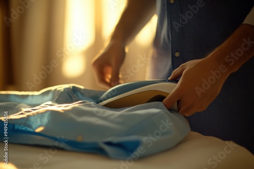 © Hafiz, Fototapeta premium Ironing a shirt close-up prime lenssoft m, with copy space