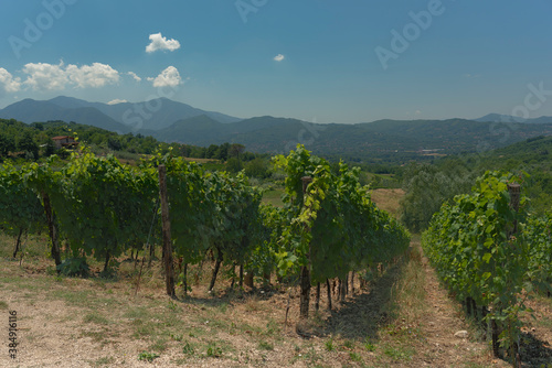 Fototapeta premium Irpinia, view of the Aglianico vineyards. Green rows under a beautiful blue sky.