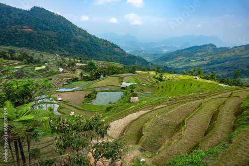 © Hans Gert Broeder, Fototapeta premium Irrigated Landscape rice terraced fields and  blue cloudy sky in the mountains near Ha Giang in northern Vietnam