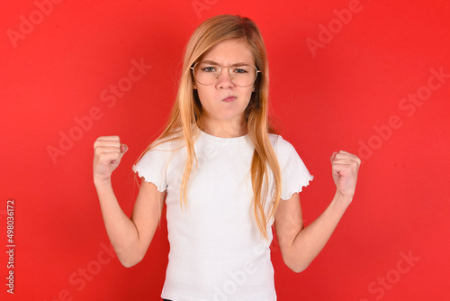 © Roquillo, Fototapeta premium Irritated blonde little kid girl wearing white t-shirt over red background blows cheeks with anger and raises clenched fists expresses rage and aggressive emotions. Furious model