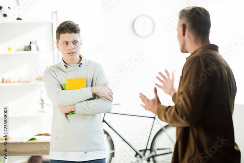 Fototapeta premium irritated father gesturing and looking at teen son at home