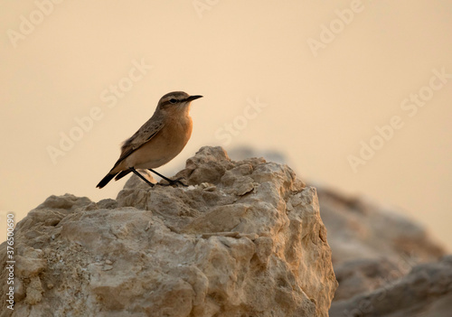 Naklejka premium Isabelline Wheatear perched on limestone rock at Busiateen coast, Bahrain