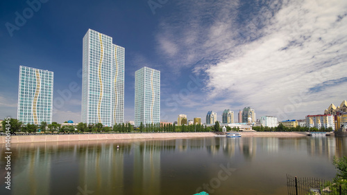 Naklejka premium Ishim River with modern towers of residential complex timelapse hyperlapse in Astana