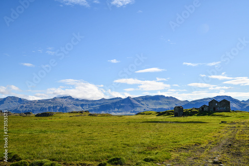Obraz premium Isländische Berge und Wiesen Landschaft mit Ruine