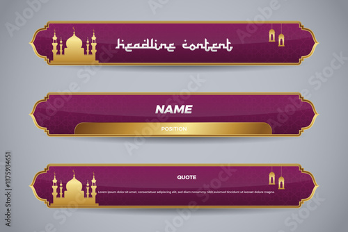 Fototapeta premium Islami Lower Third Banner Set with Mosque Silhouettes Ornate Gold Trim on Purple
