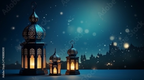 © Elchin Abilov, Fototapeta premium Islamic greeting Eid Mubarak cards for Muslim Holidays.Eid-Ul-Adha festival celebration . Ramadan Kareem backgroundand with lanterns