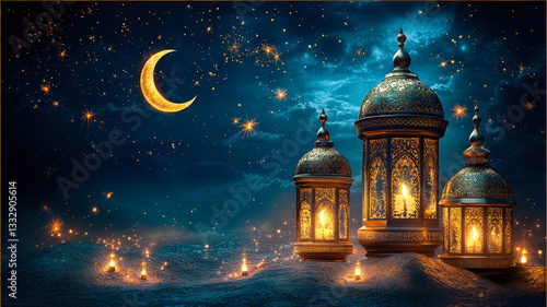 Fototapeta premium Islamic Lanterns and Crescent Moon Night Scene