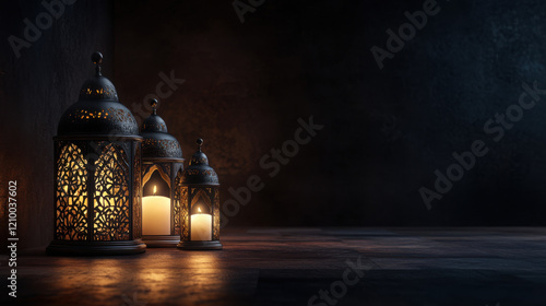 Fototapeta premium Islamic Lanterns Glowing in Dark Elegant Setting – Islamic Festive Background