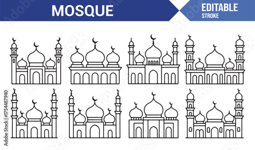 Fototapeta premium Islamic mosque outline collection — domes, arches, and minarets line drawings