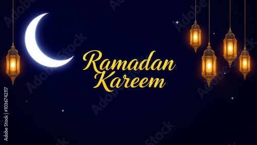 © ilkmurozg, Naklejka premium Islamic mosque with moon, stars, lanterns and clouds at night. Ramadan kareem greeting banner template vector with gold and green colours