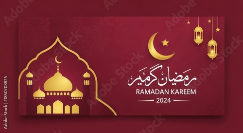 Naklejka premium Islamic ramadan kareem 2024 greeting with mosque and lanterns.