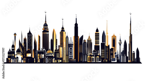Fototapeta premium Islamic Skyline Vector in Black, Gold and White. isolated transparent background