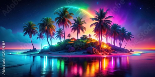 Naklejka premium Island at Night with Vibrant Neon Beach and Glowing Waters, beach, beach at...