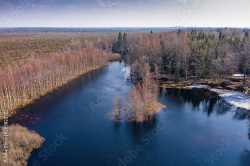 Fototapeta premium Island in the bog, golden marsh, lakes and nature environment. Sundown evening light in spring