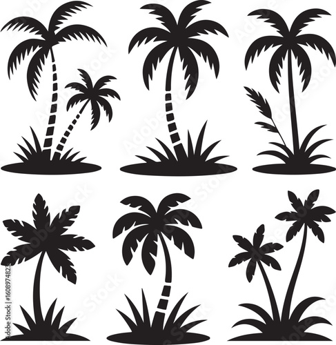 Fototapeta premium Island Landscape Silhouettes – Palm Trees, Coastal Plants, Grass and Tropical ElementsIsland Landscape Silhouettes – Palm Trees, Coastal Plants, Grass and Tropical Elements