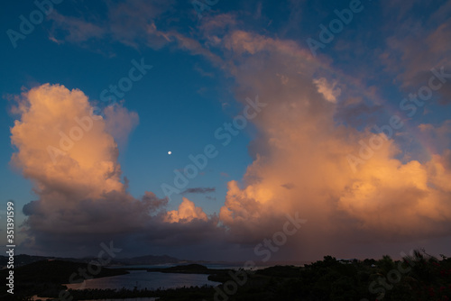 © Randy Blanchard, Fototapeta premium island sunrise with clouds, moon, and rainbow