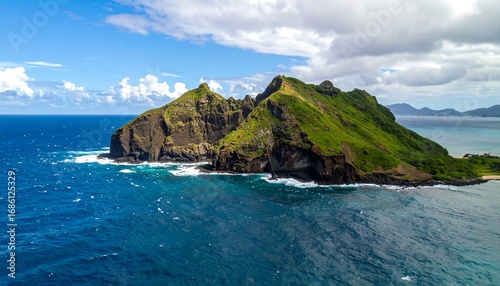 © Ikan, Fototapeta premium Island vista. High angle view of a lush green island in the middle of a vibrant blue ocean