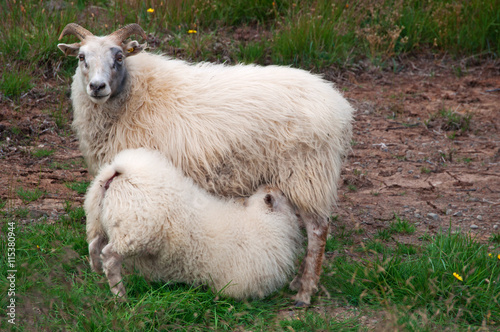 © Naeblys, Fototapeta premium Islanda: una pecora allatta dalla madre nella campagna islandese il 9 agosto 2012