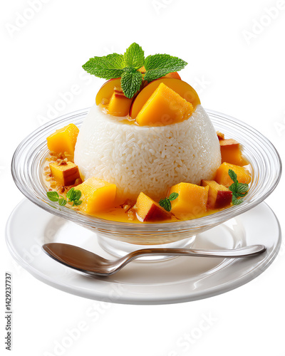 Fototapeta premium Isolate Transparent. Delicious mango dessert with rice and mint.