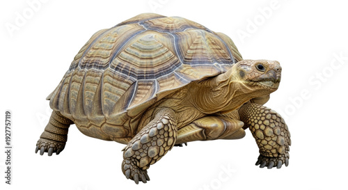 © Thaddeus, Fototapeta premium Isolated African spurred tortoise, land reptile, turtle with distinctive shell pattern